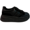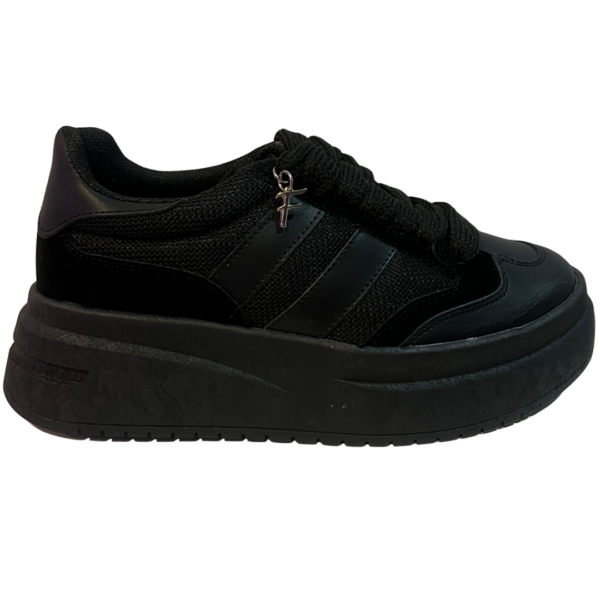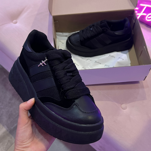 ? Tenis negros con tela y franjas en color negro, de plataforma chunky.
