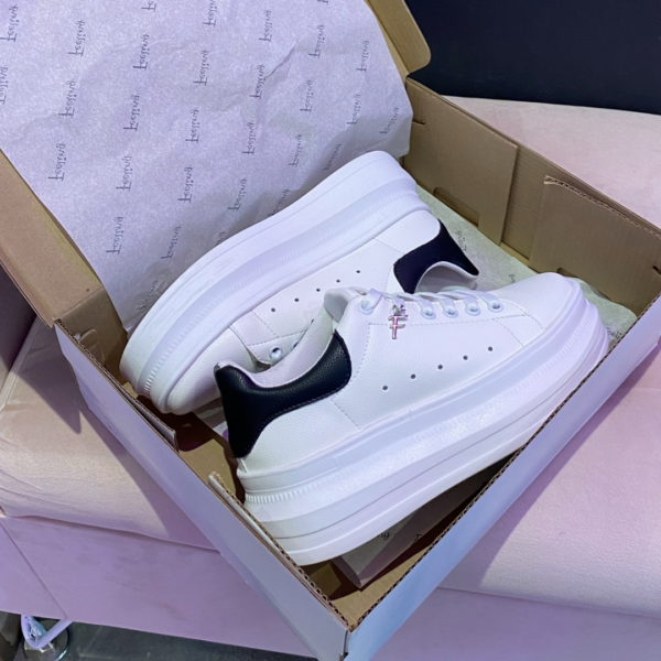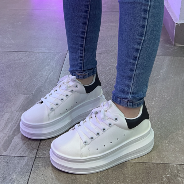 ?Tenis de cintas blancos con la parte de atrás en color negro, plataforma chunky.